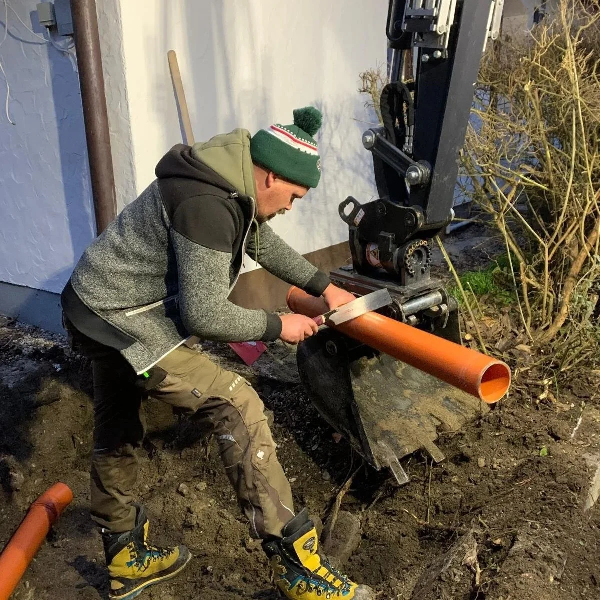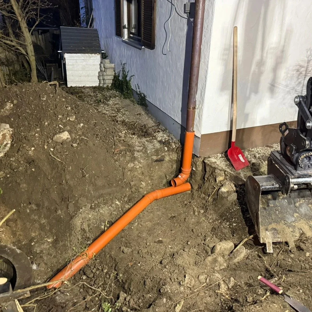 Im Rahmen dieses Projekts wurde eine bestehende Regenwasserleitung fachgerecht erneuert. Nach dem Freilegen der Leitung erfolgte der Ausbau der alten, beschädigten Rohrabschnitte. Anschließend wurde die neue Abwasserleitung sorgfältig verlegt, ausgerichtet und fachgerecht angeschlossen. Besonderes Augenmerk lag auf einer sauberen Ausführung, der richtigen Gefälleführung und einer dauerhaft sicheren Entwässerung. Nach Abschluss der Arbeiten wurde der Bereich wieder ordnungsgemäß verfüllt und hergestellt, sodass eine funktionale und langlebige Lösung entstand.