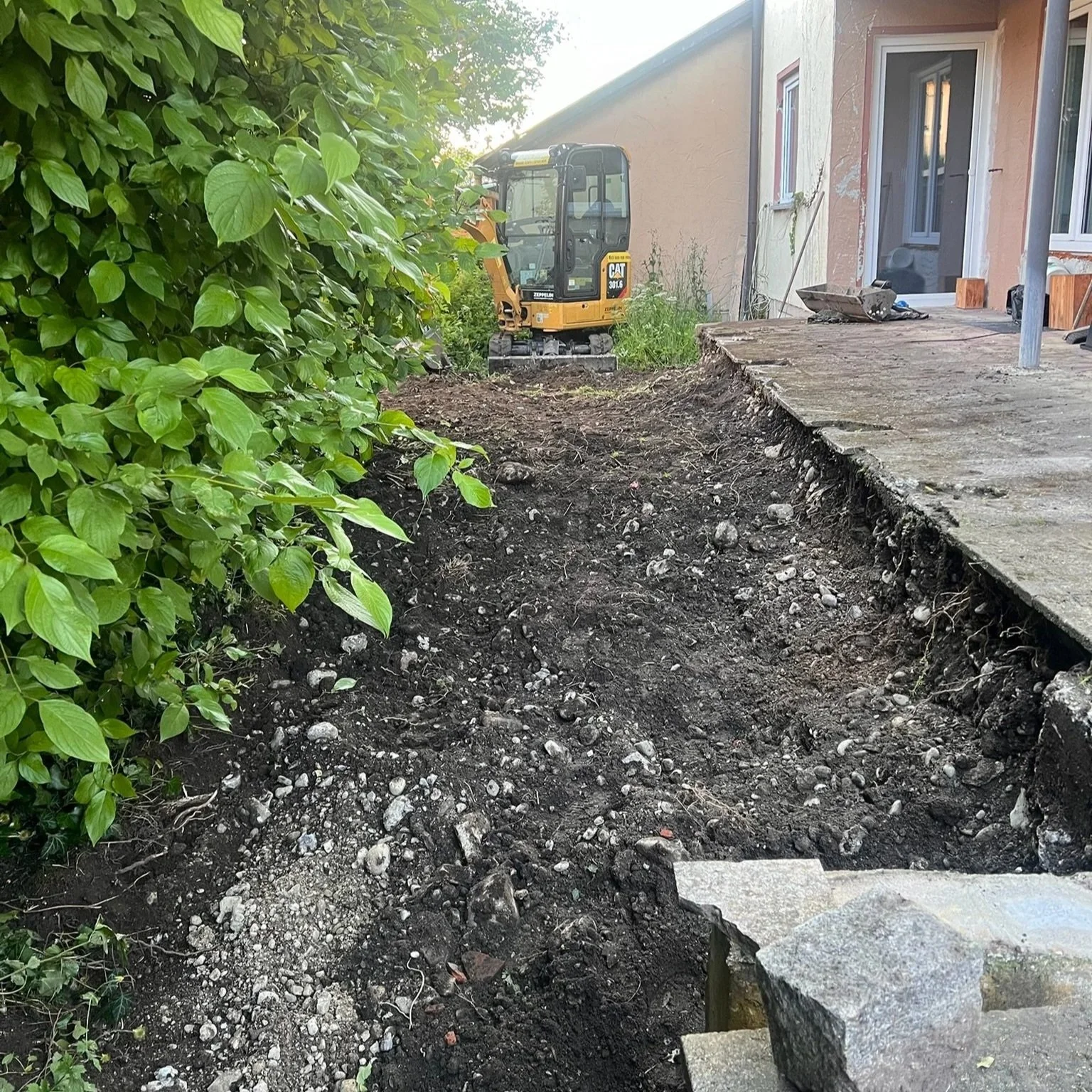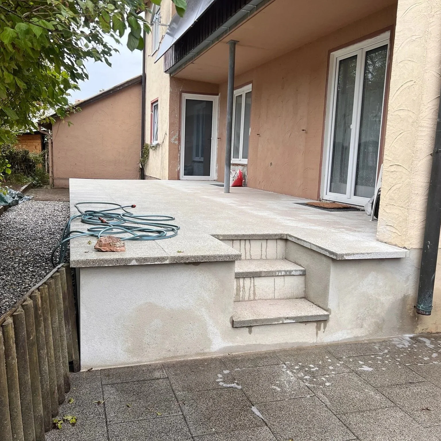Im Rahmen dieses Projekts wurde eine bestehende Terrasse fachgerecht erweitert und erneuert. Zu Beginn wurden die vorhandenen Sträucher und der Bewuchs entfernt, um Platz für die neue Terrassenfläche zu schaffen. Anschließend erfolgte die Herstellung und Betonierung des Fundaments, wobei besonderer Wert auf eine stabile und dauerhaft tragfähige Grundlage gelegt wurde. Nach dem Setzen der Stützmauer wurde das Fundament weiter aufgebaut und betoniert. Den Abschluss bildete die präzise Verlegung der Terrassenplatten. Durch die saubere Ausführung und die sorgfältige Abstimmung aller Arbeitsschritte entstand eine langlebige Terrassenerweiterung, die sich optisch harmonisch in den bestehenden Außenbereich einfügt und zusätzlichen, nutzbaren Raum schafft.
