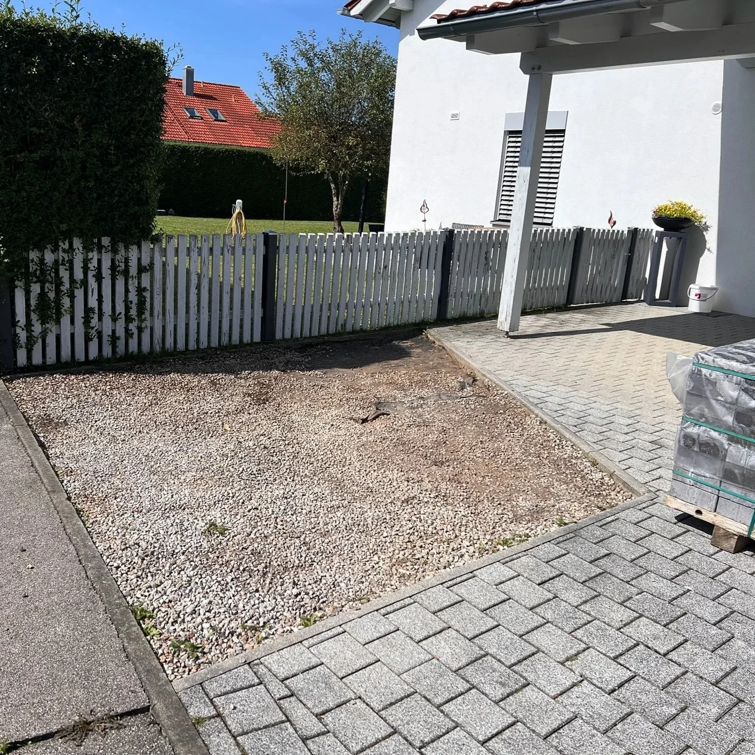 Im Rahmen dieses Projekts wurde die Stellfläche vor einem Einfamilienhaus fachgerecht erweitert und neu gepflastert. Ein Teil der Zufahrt war bereits vorhanden und wurde in die Arbeiten einbezogen. Nach sorgfältiger Vorbereitung des Untergrunds erfolgte die präzise Verlegung der neuen Pflasterfläche, wobei besonderes Augenmerk darauf lag, den bestehenden Belag optisch und handwerklich harmonisch zu ergänzen. Durch saubere Übergänge und eine gleichmäßige Ausführung entstand eine stabile, belastbare und langlebige Zufahrt, die sich stimmig in das Gesamtbild des Grundstücks einfügt.